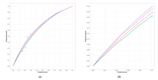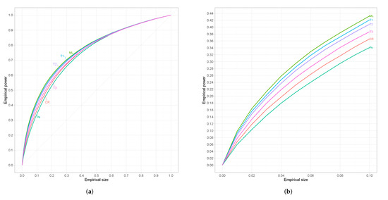 Taking into account the fact that the actual size of each test differs from the targeted nominal size, we have to make an adjustment in order to proceed further with the comparison of the tests in terms of power. We focus our interest in those tests that satisfy Dale’s criterion and follow the method proposed in [32] which involves the so-called receiver operating characteristic (ROC) curves. In particular, let be the survivor function of a general test statistic T, and be the critical value, then ROC curves can be formulated by plotting the power against the size for various values of the critical value c. Note that with we denote the distribution of the test statistic under the null hypothesis and with under the alternative.