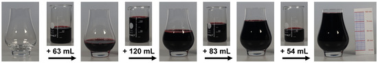 The capacity of a glass to store a fluid (here red wine) depends on the shape of the glass and changes with the fluid level. Depending on the shape of the glass vessel, different amounts of fluid are needed to raise the fluid level by 25 mm each. From left to right, the beakers contain 63 mL, 120 mL, 83 mL and 54 mL of fluid, which add to 320 mL when filled into the glass. A video sequence of filling the glass is available as Video S1.
