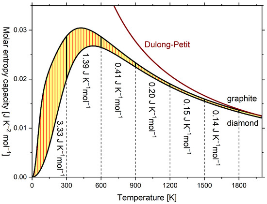 Usually, the diagrams are plotted as in Figure 3 with the temperature in the axis of ordinates and the entropy capacity on the axis of abscissae, which, however, does not change anything regarding its vivid meaning [10]. In Figure 3, in addition to the molar isobaric entropy capacity of graphite and diamond, the molar isochoric entropy capacity of the Dulong–Petit relationship (hyperbolic) is plotted. The respective and curves are given in Figure A1, but lack vivid meaning. Above 1800 K, of graphite converges to the classical Dulong–Petit relationship, which here is [36] (p. 427), and eventually exceeds it, while for diamond remains below. Here, R is the universal gas constant.