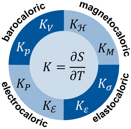 So-called caloric materials often exhibit polymorphic phase transitions, which cause the absorption or release of entropy due to changed entropy capacity, and are triggered by magnetic stress (magnetocaloric [46]), mechanical stress (elastocaloric [47]), electrical field (electrocaloric [48,49]) or hydrostatic pressure (barocaloric [45]).
