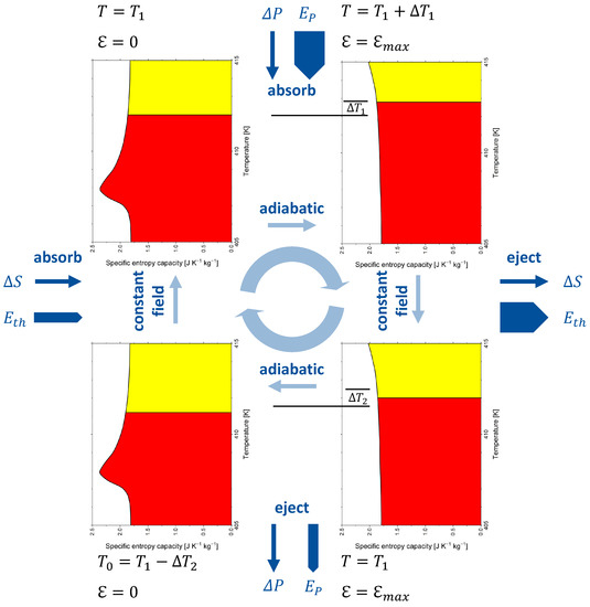 The electrocaloric cycle given by Scott [48] is adapted to barium titanate and analysed in Figure 6 with respect to entropy capacity. The cycle starts at zero field at a temperature of 412 K, slightly above the paraelectric–ferroelectric phase transition. With the electrical field applied in an adiabatic process, BaTiO becomes a narrower entropy vessel, which can store the initial entropy only with the entropy level (i.e., temperature) increased by to 412.8 K. Then, the reaction entropy is ejected and the temperature decreases to 412 K again. In another adiabatic process, the electrical field is decreased to zero again, which makes BaTiO a wider entropy vessel, and its temperature decreases to 411.2 K. Then, the entropy of an amount equal to the reaction entropy is absorbed, the temperature rises to 412 K, and the cycle is closed. The process is driven by polarisation energy and leads to the pumping of thermal energy. Note that arrows related to energy forms have different thicknesses. Reaction entropy is ejected at a higher temperature than that at which it is absorbed, which makes the associated thermal energy ejected in the warm leg of the cycle larger than the thermal energy absorbed in the cold leg of the cycle. The absorption or ejection of polarisation energy or thermal energy changes the internal energy, but none of the energy forms are part of the internal energy.