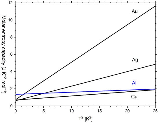 Plot of regression lines to the molar entropy capacity versus temperature squared. Based on parameters from [55] (Au, Ag, Cu) and [56] (Al) as given in Table 2.