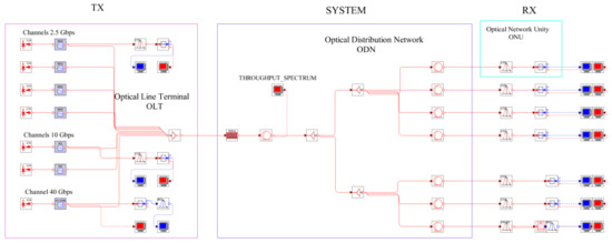 A passive optical network is a network system that sends the signal all, or almost all, of the way to the final user; it is characterized by having a point-to-multipoint distribution model, point-to-multipoint communication (P2MP) using passive components [1]. The development of PON networks continued with the emergence of gigabit-capable passive optical network (GPON) under the ITU-T-G.984 recommendation, which specifies symmetric and asymmetric transmission speeds of 2.5 Gbps for this technology. Traffic demands of up to 10 Gbps lead to the evolution from GPON to NG-PON, which is divided into two phases. The first phase refers to a PON system with a capacity of 10 Gbps in at least one direction, while, in the second phase, there is great speeds of up to 40 Gbps downstream and 10 Gbps upstream [2].