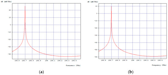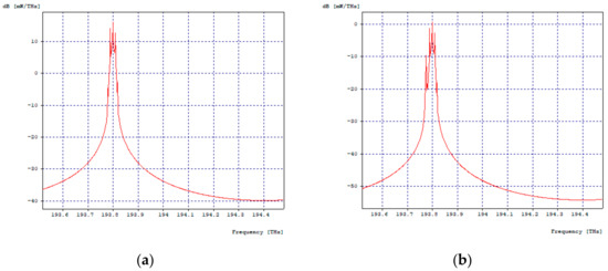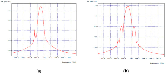 In the 40 Gbps channel, a small de-formation is observed to the left of the optical spectrum, which corresponds to the interference caused by the adjacent 10 Gbps channel. It should be noted that the spacing between the second 10 Gbps channel and the 40 Gbps channel is not sufficient for the lower speed channel not to affect the optical spectrum of the higher speed channel, but it does not affect data transmission, achieving a BER of 10−40 for both channels, Figure 5a,b.