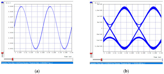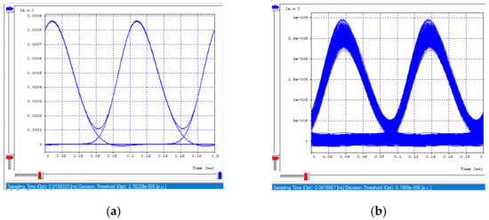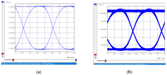 Eye diagrams, first channel 10 Gbps. (a) Transmission eye diagram; (b) Eye diagram at reception.