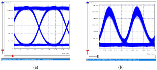 Eye diagrams, 40 Gbps channel. (a) Transmission eye diagram; (b) Eye diagram at reception.
