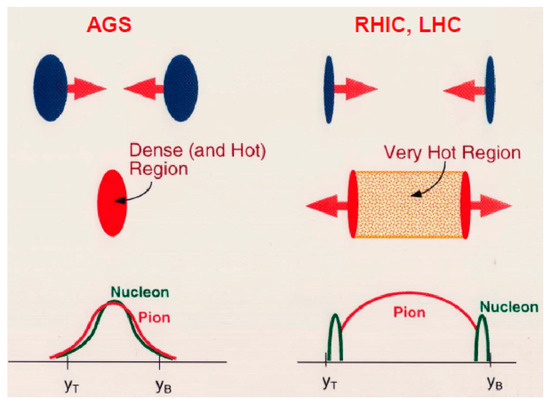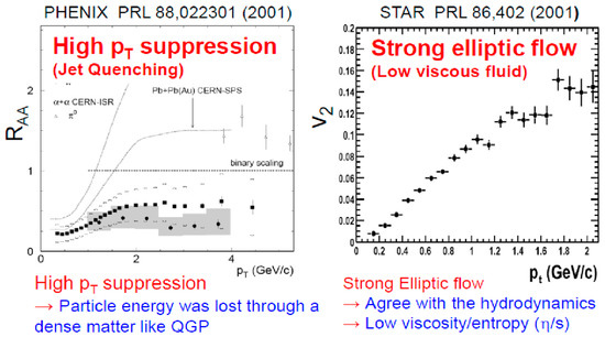 In the early universe, an accepted story is that light-mass quarks with masses of a few MeV were created immediately after the Big Bang. Then, at 10 μs after the Big Bang, the quarks were confined into nucleons (or, in general, hadrons) at temperatures of T~2 × 1012 K. At that time, the nucleon with a mass of ~1 GeV, which is significantly larger than the quark mass, was generated [1]. In relativistic heavy-ion collisions at RHIC or LHC, the colliding nuclei would penetrate through each other to create a hot and baryon-free region behind, as schematically illustrated in Figure 2 (right). In the middle region (or, in the mid-rapidity region), physicists believed that the system would be heated up well above T~2 × 1012 K and, therefore, an assembly of free quarks, antiquarks, and gluons could be created in a laboratory, as the case predicted in the early universe. The first experimental goal of the relativistic heavy-ion collisions at RHIC and LHC is to find a deconfined quark phase called the quark–gluon plasma. I will briefly review experimental progress in Section 2.