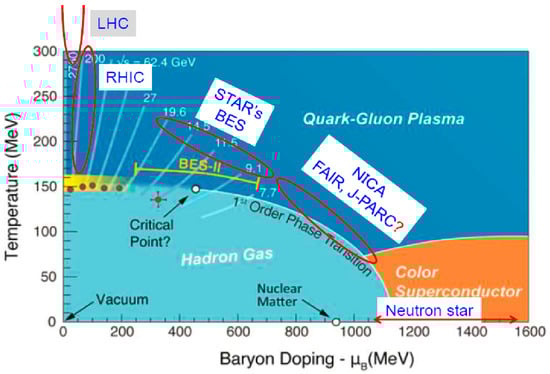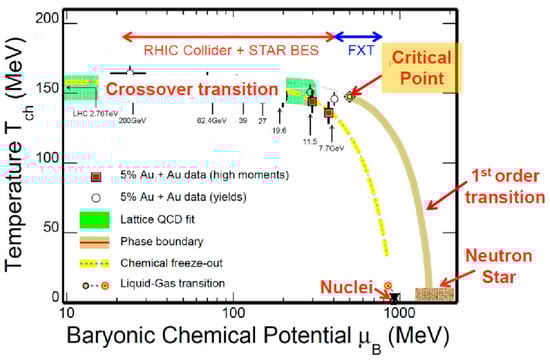 A phase diagram of nuclear matter in terms of temperature and baryonic chemical potential is shown, again, in Figure 14 [31]. In this figure, the baryonic chemical potential (μB) is plotted in a log scale, while the temperature is on a linear scale, similarly to Figure 10. The coverage of the STAR BES is also presented in this figure. At RHIC and LHC, no sudden phase transitions were observed from the hadronic phase to QGP. This transition is conventionally called the crossover transition. On the other hand, the first-order phase transition might or would be expected at high density. When the first-order transition occurs, the starting point of the first-order transition is named the “critical point” [32,33]. (See the review of the QCD phase diagram on this point [33].) The first goal of the STAR BES was to explore if this critical point exists [31,34].