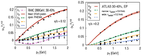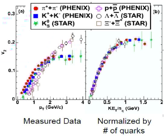 At RHIC, if all the available data of v2 flow values are normalized by the number of quarks nq, namely, two for mesons and three for baryons, then, the entire plots of v2/nq vs. KET/nq seem to be on the same curve [11,12], as shown in Figure 6, where KET = (m2 + (pT)2)1/2 − m. This is called the quark number scaling and, again, this fact gives a strong hint on the formation of bulk QGP.