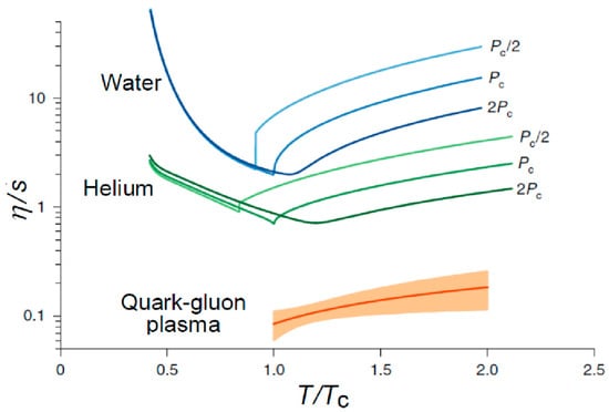 In Figure 8, the values of η/s are compared for several liquids, H2O, He, and QGP. The value for QGP is much smaller than in any other case. Additionally, among QGP, the η/s increases slightly as temperature increases from TC.