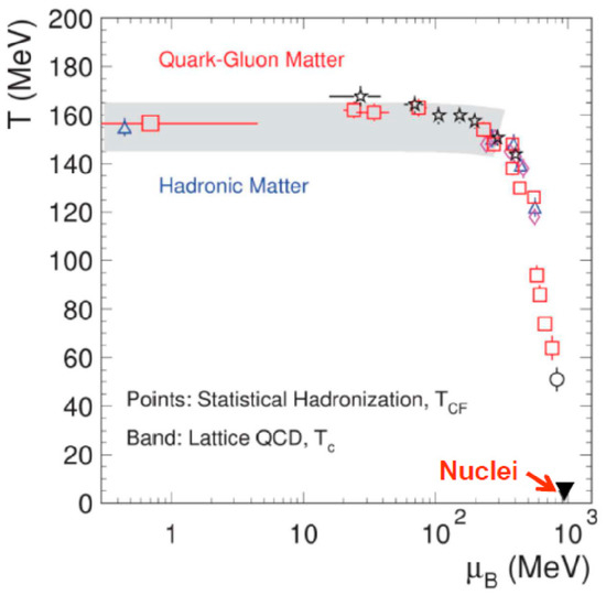 - Andronic, A.; Braun-Munzinger, P.; Redlich, K.; Stachel, J. Decoding the phase structure of QCD via particle production at high energy. Nature 2018, 561, 321–330. [Google Scholar] [CrossRef] [Green Version]