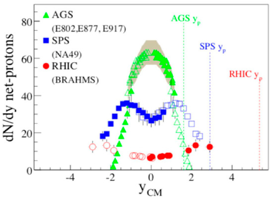 First, a comparison of baryon distributions among AGS, SPS, and RHIC energy regions is shown in Figure 11 [22]. In the central region, namely at around yCM = 0, the density of baryons is almost zero at the RHIC energies at 200 AGeV in a collider mode, as intuitively explained in Figure 2. At the SPS energies of 200 AGeV on a fixed target, the density is finite in the mid-rapidity region, while the collision is still forward and backward peaked. Finally, at the AGS energies of 11–14 AGeV on a fixed target, the baryon density is peaked at yCM = 0. The nucleons seem to stop each other in the center-of-mass frame at 10–20 AGeV.