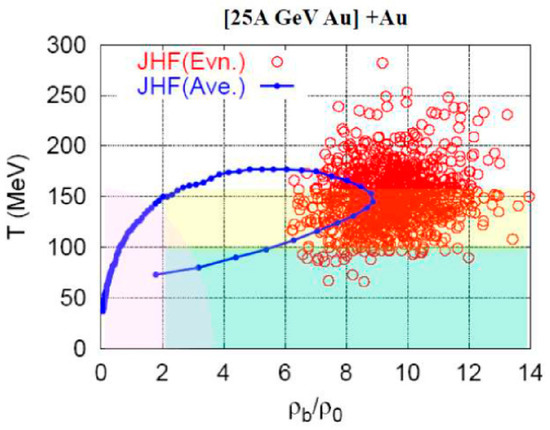 Before the J-PARC construction, a prototype project called the JHF was planned at KEK in Japan. Here, the accelerations of heavy-ions were planned. Therefore, Onishi [26] created a plot for the collision path at JHF at 25 AGeV heavy-ions, as shown in Figure 13. This hadron cascade calculation predicts that 9 times the normal nuclear matter density could be expected. The value of γcm in this case is ~3.5 so that 7ρ0 would be expected, while the calculated value is larger than this 7ρ0.