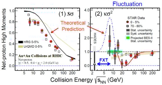 - Adam, J.; Adamczyk, L.; Adams, J.R.; Adkins, J.K.; Agakishiev, G.; Aggarwal, M.M.; Ahammed, Z.; Alekseev, I.; Anderson, D.M.; Aparin, A.; et al. (STAR Collaboration), Nonmonotonic Energy Dependence of Net-Proton Number Fluctuations. Phys. Rev. Lett. 2021, 126, 092301. [Google Scholar] [CrossRef] [PubMed]