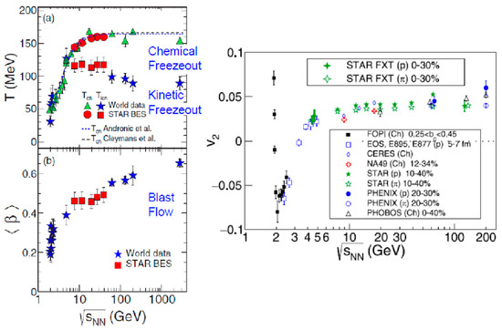 Other illuminating data from the STAR BES are shown in Figure 16. Figure 16 (left) shows the chemical freezeout temperature Tch, together with the kinetic freezeout temperature Tkin and a transverse blast wave flow velocity <β>. A method of how to decompose kinematical and blast waves has been known for a long time since the prediction by Siemens and Rasmussen [35] as well as from the data at the Bevalac [36]. Now, the value of Tch stays almost constant at above √sNN = 8 GeV. On the other hand, both Tch and Tkin merge at around √sNN = 6–8 GeV, and they sharply drop below this energy region. In addition, the value of <β> sharply drops below √sNN = 6–8 GeV. The other data, shown in Figure 16 (right) [36], also show a sudden drop in the v2 value below √sNN = 6–8 GeV. The elliptical flow even changes its sign from plus to minus at around √sNN = 3–4 GeV.