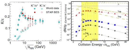 The third point is strangeness enhancement at around √sNN = 8 GeV, as shown in Figure 17 (left). There, K+/π+ ratios are enhanced as compared to K−/π− ratios [37]. At the AGS, initial studies on this point were performed for the first time [39]. These phenomena were interpreted by a thermal model [40], but a peak at around √sNN = 8 GeV suggests a change of freedom, either baryonic to mesonic freezeout [41] or hadrons to QGP [42]. This would be an important aspect when one plans experiments in the compressed baryon matter [31].