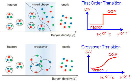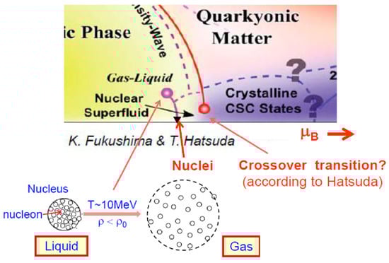 At this point, let us explain the difference between the crossover transition and the first-order transition. The entropy per volume increases rapidly in the first-order transition, while it increases gradually and smoothly in the crossover transition, as illustrated in Figure 18 (right). At a high-temperature region at zero baryon density, it has been confirmed that the crossover transition occurs, while at a high-density region no one knows if the transition is via the first order or by the crossover. Fukushima and Hatsuda [33] proposed a phase diagram, as shown in Figure 19. In this diagram, “Gas-Liquid” is written, which is a well-known liquid–gas phase transition [44]. The normal nucleus is regarded as a liquid, while if it were heated up to T~10 MeV, the nucleus would expand and dissolve into individual nucleons, and these nucleons behave like a gas. This transition is illustrated there. On the other hand, at the high-density region, Hatsuda et al. [45] recently proposed that the transition from the normal matter density to higher density must be the crossover transition, at least in the small temperature region, as illustrated in Figure 18 (bottom) as well as in Figure 19. This point must be studied experimentally in the future.