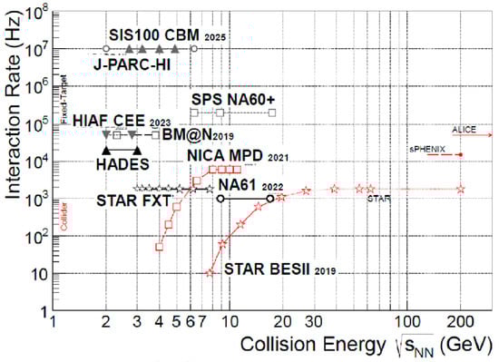 A summary of the current and future accelerators in the low-energy region toward high-density regions is illustrated in Figure 20 [47]. The STAR FXT, as well as the NICA collider, cover relatively higher energy regions while at low luminosities. On the other hand, FAIR, HIAF, and J-PARC-HI cover higher interaction regions due to the high-flux accelerators on a fixed target. The reaction rate reaches up to 10 MHz.