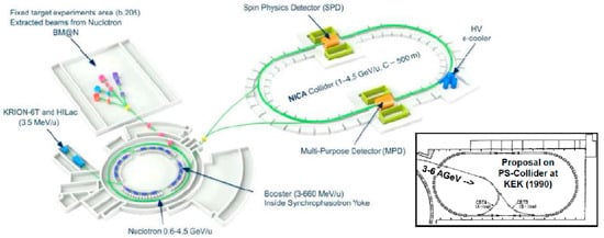 NICA project, which was completed in 2020. Beams from the Nucleotron at 4.5 AGeV are injected into a collider called NICA. Figure is taken from [48]. In the inset, a proposed project from 1990, called the PS-Collider [49] at KEK, is shown, although this project was not approved.