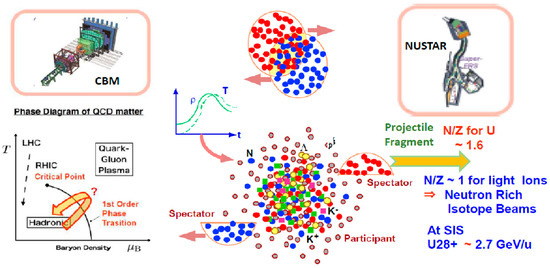 Two major experiments [51] are planned at SIS100, as shown in Figure 23. The first, called the CBM experiment, is to seek high-density matter from the participant regions of heavy-ion collisions. In the plane of T (temperature) and ρ (density), the collision will sweep both high density and high (but lower than at RHIC and LHC) temperature regions, as illustrated in Figure 23. It is possible that the system might dive into a new phase through the first-order phase transition. The other experiment, called the NUSTAR experiment, is to utilize the projectile spectators as beams. If incoming original beams are uranium, the neutron to proton ratio is about 1.6, whereas the neutron to proton ratio is almost 1 for light nuclei. Therefore, these fragments will create neutron-rich isotope beams. The latter type of study is already in progress in many facilities in the world.