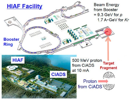This HIAF facility has another important goal. Near to this facility a big ADS proton driver called CiADS (China Initiative Accelerator Driven System) exists [53], at which extremely high-flux proton beams up to 10 mA can be accelerated. By using target fragments in pA collisions, as shown in Figure 24, they can use high-flux neutron-rich isotope ions as ion sources for the HIAF, as in the case seen in the ISOL facility at CERN.