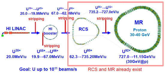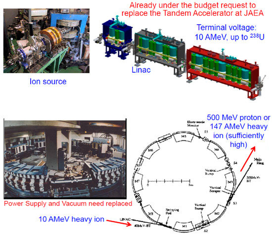 The J-PARC is a proton accelerator that provides high-flux beams at 750 kW for 3 GeV at RCS ring and 500 kW for 30 GeV at the main ring (MR). This J-PARC was constructed by a joint effort between two organizations, KEK and JAEA (Japan Atomic Energy Agency), and it has been delivering beams since 2009. The idea to accelerate heavy-ion beams at J-PARC was born about 10 years ago. This is called the J-PARC Heavy Ion Facility, abbreviated the J-PARC-HI [54]. The accelerator group has investigated accelerating heavy-ion beams up to uranium at high intensities, by constructing linac and booster rings, as shown in Figure 25.