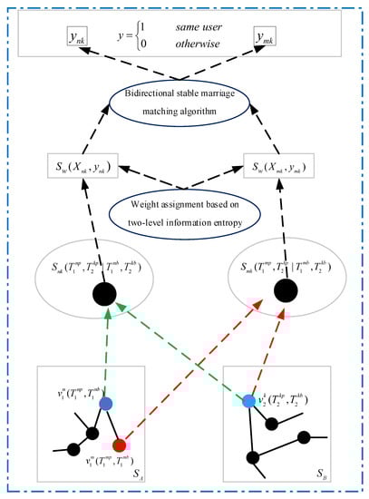 As shown in Figure 2, we combine the three types of user information to extract user information redundancy in different types of information, and use different calculation methods to obtain similarity according to the nature of features. Specifically, given two social media A and B, and their corresponding three user accounts , , and , where , . The weight-based similarity corresponding to user account , , and are . Taking user accounts and as an example, this pair of user accounts is mapped to node . Therefore, the identification problem of user accounts and is transformed into a classification problem. Next, we fuse and analyze the similarity of user’s multi-dimensional information, use the bidirectional stable marriage matching algorithm for user identification across social media, and output the final account matching results. That is, we need to determine whether is equal to 1.