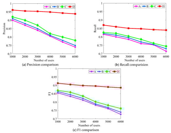 From Figure 4, it can be seen that the performance of all four schemes tends to decrease as the number of matched pairs increases; however, it can be seen that the rate of decrease of scheme D is flatter compared to the other three schemes. This is because solution D fuses and analyzes the multi-dimensional information of users and has better universality. We observe that scheme D is improved by 15.98%, 14.49%, and 13.31% in terms of precision compared to A, B, and C, respectively. For recall, we observe that scenario D improves 13.23%, 12.14%, and 10.01% compared to A, B, and C, respectively. Similarly, for F1, we observe that scenario D improves 14.23%, 13.14%, and 11.78% compared to A, B, and C, respectively.