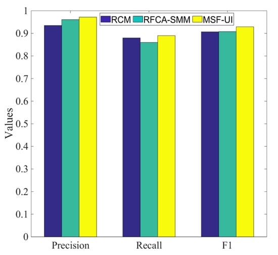 It can be seen from Figure 5 that MSF-UI is superior to RFCA-SMM and RCM in terms of precision, recall, and F1. MSF-UI combines the three types of user information. Compared with RFCA-SMM, MSF-UI greatly reduces the amount of user information used and effectively protects user privacy. Compared with RCM, MSF-UI is not restricted by seed nodes, which is of great significance for improving the robustness of user identification. In order to more clearly characterize the effectiveness of MSF-UI, it can be seen from the comparison of evaluation indicators of user identification in Figure 5 that in terms of precision, MSF-UI is higher than RCM and RFCA-SMM by 3.7% and 1.1%, respectively. In terms of recall rate, MSF-UI is 1% and 3% higher than RCM and RFCA-SMM, respectively. Moreover, in terms of F1, MSF-UI improved this metric by 2.2% and 2.1% compared to RCM and RFCA-SMM, respectively. Through the above analysis, the algorithm proposed in this paper will get better identification results in practical applications, which fully demonstrates the effectiveness of MSF-UI. Furthermore, to better demonstrate the progressiveness of our work, we also compare with our newly published work [2].