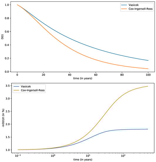 In economics and finance, one of the most consequential developments is that of “discounting”, which essentially attempts to answer the crucial question of what the price will be in the future. In other words, discounting weighs the future relative to the present. Traditionally, the weighting procedure has been performed through a decreasing exponential. Thus, under a constant interest rate r, continuously compounded, a dollar invested today at time yields dollars at time t []; hence, one dollar in any future time t is worth today. This statement is true under constant and fixed rates; however, in real life, rates are random, and this uncertainty makes it completely unrealistic to represent rates by constant quantities or even by deterministic functions of time, and, as a consequence, random models for rates must be addressed.