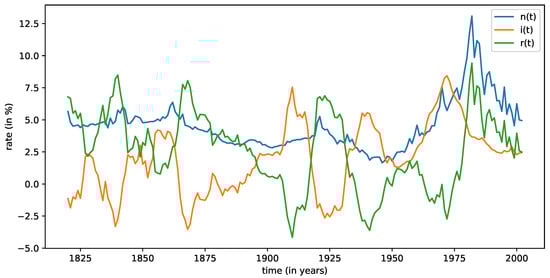 In our empirical analysis, the nominal rates are determined by IG rates constructed from the 10-year Government Bond Yield with = 10 years. Thus, looking at Equations (63) and (64), we estimate the nominal rates by