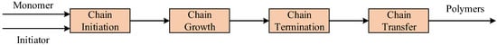 For a polymerization process, the monomer is transformed into a polymer through a series of chemical reactions. The free radical polymerization process includes chain initiation, chain growth, chain transfer and chain termination. The reaction forming monomer free radicals is called the chain initiation reaction, and it is the key to controlling the rate throughout the polymerization reaction. An initiator added to the monomer is heated to generate initiating radicals, and once the free radical monomer is generated, it will immediately be added to the second monomer to generate a free radical chain containing two monomer units. The activity of the free radical chain does not decay; it will immediately be added to the third monomer and subsequent monomers in the chain. Then, the degree of polymerization of chain radicals increases rapidly; these reactions that increase the degree of polymerization are called chain growth reactions. The binding reaction of free radicals is called a termination reaction, which has two forms: coupling and disproportionation. In addition, the chain free radicals undergo a transfer reaction with monomers, initiators or formed macromolecules, whereby a polymer chain is terminated, and a new radical capable of propagating is formed. The schematization of proposed reaction mechanisms is shown as Figure 1.