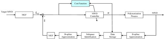 The dynamic MWD of the polymerization process can be obtained by the MWD model described in [33] or measured directly through online techniques, and it cannot be easily used in MWD shape control directly. Therefore, a B-spline approximation model is established through the obtained MWD data. Through the weight data of the B-spline model and the control input, the output MWD model can be identified by the N4SID method, which is used in MWD control described later. The schematic diagram of the proposed control algorithm is shown in Figure 2. By using the moment-generating function (MGF), the pseudo-state vector of the target MWD and approximated MWD can be obtained as and , respectively. The control input, , is regulated by the MWD controller for the shaping of output MWD.