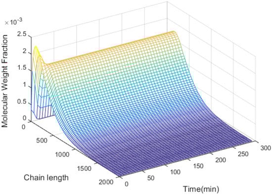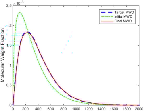 Polymers are high molecular compounds consisting of macromolecules with different chain lengths [1]. The properties of polymers are affected by their molecular weight distribution (MWD) [2,3,4,5,6], which can be measured directly or modelled mathematically [7,8,9]. The production of polymers is widespread and long-standing in industrial processes; different applications need different specifications for the polymers [10]. To meet these demands, many performance indices consisting of polydispersity and average molecular weight have been proposed. Under these indices, the control objective is commonly dealt with as an optimization problem, which has been investigated in many studies [11,12,13,14,15,16,17,18,19,20,21]. Though satisfactory control performance could be obtained in these studies, these indices cannot fully characterize the entire molecular weight distribution of polymers.