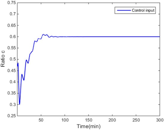 In this section, the performance of the proposed controller was tested in a styrene polymerization process. Styrene was the monomer for polymerization, and azobisisobutyronitrile was used as the initiator. The monomer and the initiator were blended and pumped into a tank reactor where the polymerization occurred, after which the styrene polymers were produced. Since the ratio of the monomer to the initiator is essential and critical to the polymerization process in the reaction tank, the ratio of the flow rate of the monomer to the sum flow rate, defined as , is regarded as the manipulated variable in the MWD control system.