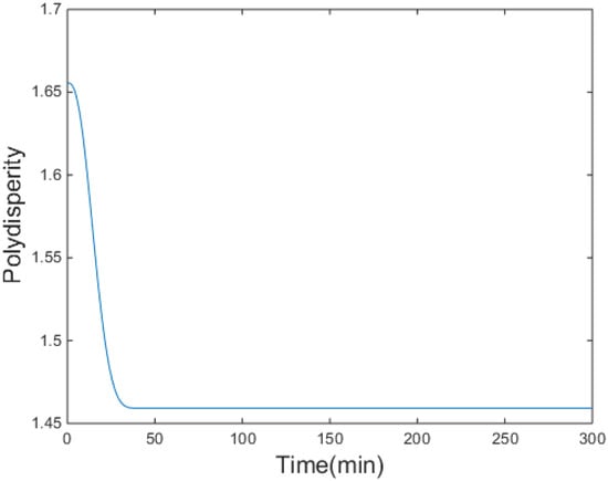 Figure 4 demonstrates that the performance criterion can be regulated to a small value in a relatively short time by the proposed control method. The MWDs of the polymerization process at certain times are demonstrated in Figure 5. The variations of the ratio (manipulated variable of the control system) are illustrated in Figure 6, and the variations are within a proper range; the ratio keeps relatively stable when the MWD of the polymerization process is regulated close to the target one. The evolution of the MWD is illustrated by a three-dimensional graph in Figure 7. The change in the polydispersity over time is shown in Figure 8, which can be kept within a proper range. It can be seen that the MWD of the polymerization process gradually approaches the target MWD when the performance criterion gradually becomes smaller under the proposed algorithm.