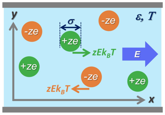 We consider a binary ionic mixture of cations and anions which have equal size and equal but opposite charge using the primitive model [1]. In this model, the z-valent ions in symmetric mixtures are modeled by equisized charged hard spheres of diameter immersed in a structureless and uniform dielectric medium with dielectric constant at a temperature T. The charged spheres interact via pairwise potential () where , , and denote cation–cation, cation–anion, and anion–anion interaction potentials at a separation of , respectively. Figure 1 presents a schematic of the 2D primitive model in Cartesian coordinates, illustrating that the electrophoretic force is exerted on a single ion due to normalized electric field applied in the x-direction parallel to the unit vector .