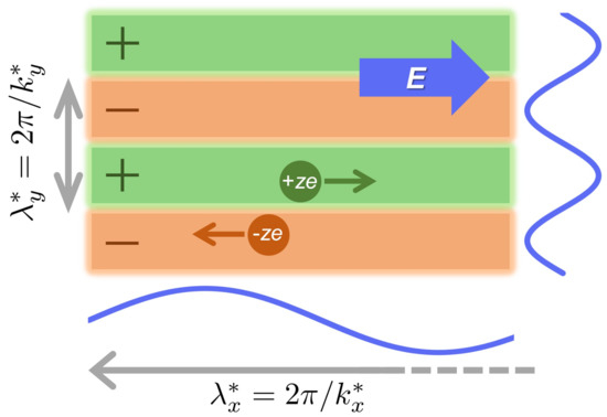 (ii) On the uniformity of lanes in terms of correlation function analysis based on the stochastic DFT—The second purpose is to validate the approximation necessary to explain lane formation using the linear stability analysis [9,10,17,18]. Previous studies on lane phenomena have neglected the charge density modulation of the x-direction. In other words, has been assumed when investigating the charge density modulation in the transverse direction to the electric field. The correlation function analysis allows for the investigation of oscillatory decay behaviors such as the oscillatory wavelength () along the electric field. Figure 2 is a schematic of this, which illustrates the emergence of the charge modulation, or the oscillatory charge-charge correlation due to the lane formation. We perform both the asymptotic analysis of charge–charge correlations for point charges (i.e., the primitive model at ) and the 2D inverse Fourier transform of the stationary charge–charge correlation function for charged hard spheres (i.e., the primitive model for ). While the asymptotic analysis will prove that diverges at the stabilization condition of lane structure, the real-space representation of the charge–charge correlation function will clarify the decay of oscillatory correlations in lane structures as a result of the inverse Fourier transform.
