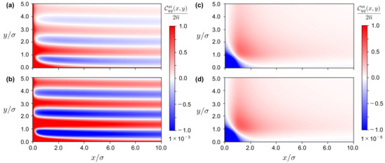 Third, the difference between the results in Figure 4 on the left and right sides reveals that anisotropic oscillatory correlations, which reflect the lane formation, disappear in Figure 4c,d because of the absence of the fluctuating flow, , given by Equations (13) and (14). It is also important to note that the scale of the color bar on the right side is times the scale on the left side. In other words, is almost zero in Figure 4c,d. The weak charge–charge correlations imply that electric-field-driven binary ionic mixtures are uniform in the absence of the fluctuating flow which arises from collisions due to oppositely driven migrations of cations and anions.