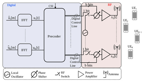 Figure 1 shows a MU-MISO system with N transmit antennas and KUE that each have a single antenna. The base station has one message per UE and each antenna has a resolution of 1 bit for the amplitude (on-off switch) and b bits for the phase per antenna. All other hardware components are ideal: linear, infinite bandwidth, no distortions except for AWGN.