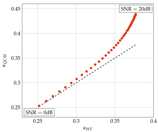 Finally, one might expect that is close to the of the transmit Wiener filter [6,7] since our cost function accounts for the noise power. However, Figure 2 shows that this is true only at low SNR. The figure plots the average of the QCM algorithm, called , against the computed for simulations with System A in Section 5. Note that is generally larger than .