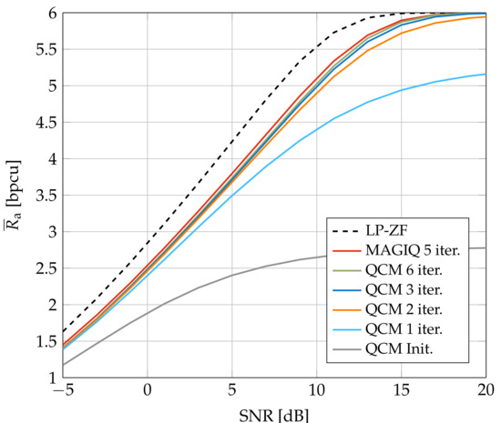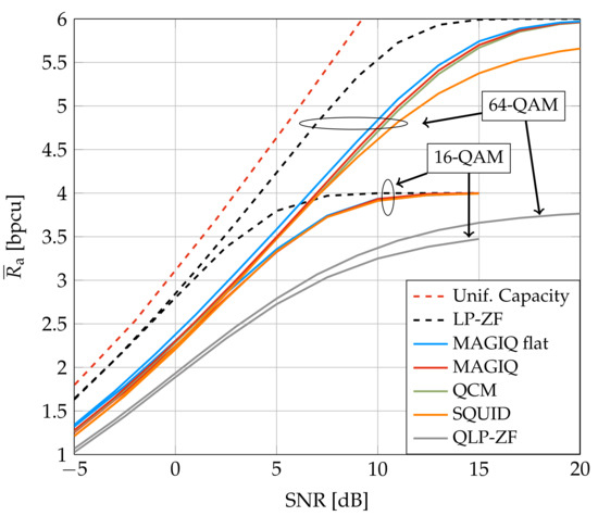 Figure 3 and Figure 4 show the average GMI for System A with and , respectively. In Figure 3, MAGIQ performs four iterations for each OFDM symbol while QCM performs six iterations. Observe that MAGIQ and QCM are best at all SNR and they are especially good in the interesting regime of high SNR and rates. The gap to the rates over flat fading channels () is small. SQUID with 64-QAM requires 100–300 iterations for dB and a modified algorithm with damped updates, otherwise SQUID diverges. In addition, we show the broadcast channel capacity with uniform power allocation and Gaussian signaling as an upper bound for the considered scenario [52,53]. Figure 4 shows that QCM with three iterations operates within ≈0.2–0.4 dB of MAGIQ with five iterations when , which shows that QCM performs almost as well as MAGIQ.
