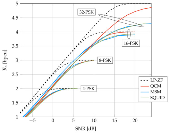 Figure 5 compares achievable rates of QCM, SQUID, and MSM for a smaller system studied in [42]. We use PSK because the MSM algorithm was designed for PSK. The figure shows that MSM outperforms SQUID and QCM at low to intermediate SNR and rates, but QCM is best at high SNR and rates. This suggests that modifying the cost function (8) to include a safety margin will increase the QCM rate at low to intermediate SNR, and similarly modifying the MSM optimization to more closely resemble QCM will increase the MSM rate at high SNR. We tried to simulate MSM for System A but the algorithm ran into memory limitations (we used 2 AMD EPYC 7282 16-Core processors, 125 GB of system memory, and Matlab with both dual-simplex and interior-point solvers).