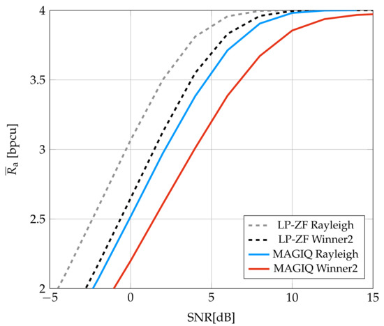 Figure 6 shows the average GMI for LP-ZF and MAGIQ. At high SNR, there is a slight decrease in the slope of the MAGIQ GMI as compared to LP-ZF. This suggests that one might need a larger N or b. The performance for the Rayleigh fading model is better than for the Winner2 model but otherwise behaves similarly.