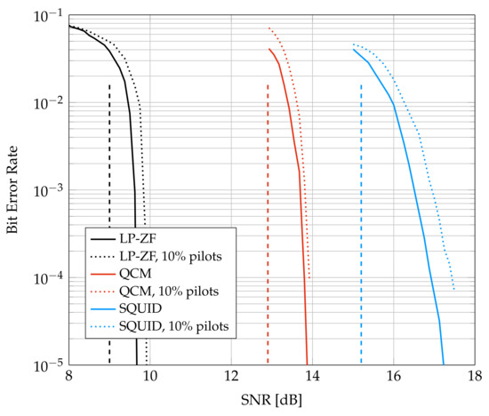 The dashed curves in Figure 7 show the SNR required for the different algorithms based on Figure 3. In particular, the rate 5.33 bpcu requires SNR of 9 dB, 12.9 dB, and 15.2 dB for LP-ZF, QCM, and SQUID, respectively. SQUID is run with 300 iterations and QCM is run with 6 iterations. Each UE computes its log-likelihoods based on the parameters (20) of the auxiliary channel. The GMI predicts the coded behavior of the system within approximately 1 dB of the code waterfall region, except for SQUID, where the gap is about 2 dB. The gap seems to be caused mainly by the finite-blocklength of the LDPC code, since the smaller gap of approximately 1 dB is also observed for additive white Gaussian noise (AWGN) channels. The sizes of the gaps are different, and the reason may be that the slopes of the GMI at rate 5.33 bpcu are different, see Figure 3. Observe that LP-ZF exhibits the steepest slope and SQUID the flattest at bpcu; this suggests that SQUID’s SNR performance is more sensitive to the blocklength.