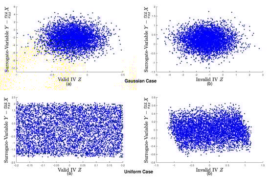 Let be the surrogate-variable of relative to Z. Figure 4 shows the scatter plots of Z and for two cases. Interestingly, in the Gaussian case, we find that no matter whether Z is an IV or not, Z and are statistically independent, while in the uniform case, Z and are statistically dependent if Z is an invalid IV. These observations imply that the non-Gaussianity (as indicated by the uniform distribution) is beneficial to find out whether a continuous variable is a candidate IV relative to .