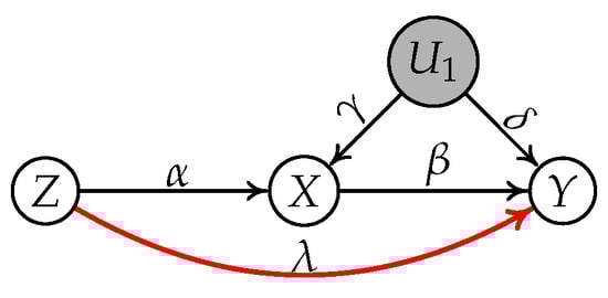There exist works in the literature that address the continuous variable setting. Kuroki and Cai [] utilized vanishing Tetrad conditions [] and proposed a new necessary condition to solve this problem in the linear structural causal model. However, their method needs at least three valid IVs in the observed variables. Kang et al. [] proposed the sisVIVE algorithm to estimate the causal effect in the case where more than half of the variables are valid IVs in the observed variables. Later, Silva and Shimizu [] appear to be the first to exploit the non-Gaussianity property in the linear structural causal model. They utilized the generalized Tetrad conditions (t-separation) [,] and designed a IV-TETRAD algorithm to select IVs. Unfortunately, their conditions still require two or more IVs as a prerequisite for instrument testing and may rule out some correct IVs. For instance, consider the causal graph in Figure 1. Assume the causal relationships between variables are linear and that the noise terms follow non-Gaussian distributions. Then, the IV-TETRAD returns an empty set of candidate IVs though Z is a valid IV relative to .