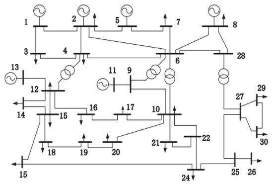 In the simulations, three test systems, including the IEEE 14-bus system, the IEEE 30-bus system, and the IEEE 57-bus system are adopted for PSSE to illustrate the effectiveness and superiority of the proposed MCVUKF and En-MCVUKF algorithms under different types of non-Gaussian noises. Figure 1 shows the structure of the IEEE 30-bus test system [29]. The data used for the simulation are the power system data, which are obtained from the University of Washington Power System Test Case Archive (http://www.ee.washington.edu/research/pstca/, accessed on 13 March 2022). In order to demonstrate the filtering performance of the proposed algorithms, three different scenarios are used in the simulations [28].