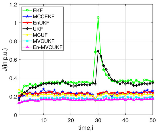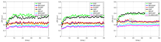 Apart from the non-Gaussian noise with outliers in measurements, there are many undesired events that may take place in power systems for dynamic state estimation: for example, bad measurement data and sudden load state change. In order to further verify the robustness of the proposed MVCUKF and En-MVCUKF methods, this scenario is tested in which the bad data are incorporated in the measurement. Specifically, we expand 20% of the reactive power measurements at and conduct the simulation in the IEEE-30 bus test system. The overall filtering performance of all KF methods at all times is shown in Figure 4. Obviously, one can observe that from this figure, the proposed methods still have better filtering performance than other compared KF methods. Moreover, these robust KF methods, e.g., MVCUKF, En-MVCUKF, MCUF, and MCCEKF, are not sensitive to this abnormal measurement.