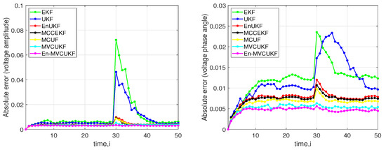 Then, we also tested the scenario that a sudden load change happened in the power system to study the robustness of the proposed methods. Similar to previous simulation, the IEEE-30 bus test system is utilized, and the state estimation at bus 3 is captured when the power load at bus 3 has a 20% drop at this time. The absolute error of voltage amplitude and voltage phase angle at bus 3 in the IEEE-30 bus test system are illustrated in Figure 5, in which the values of absolute error (in terms of voltage amplitude and voltage phase angle) for MVCUKF and En-MVCUKF are still lower than those of the other compared KF methods, which confirms the effectiveness and robustness of the proposed methods for dealing with the case of sudden load change.